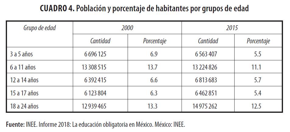 Entre 2000 y 2015 el número de niños y jóvenes menores de 18 años aumentó, pero su peso entre el total de la población disminuyó; en el mismo periodo de tiempo, los niños de 3 a 11 años no sólo redujeron su proporción, sino que hubo una baja en términos absolutos de la población (véase cuadro 4). Lo anterior da cuenta de un cambio en la estructura etaria de los mexicanos en la que la población de niños y jóvenes ha ido descendiendo paulatinamente. En lo que respecta a la población entre 15 y 17 años –edad idónea para cursar la Educación Media Superior (EMS)–, su peso relativo también ha disminuido: de 6.3% en 2000 a 5.4% en 2015. Sin embargo, en términos absolutos ha presentado un crecimiento promedio anual de 0.4% en el periodo 2000-2015 (por debajo del crecimiento total de la población; INEE, 2018).