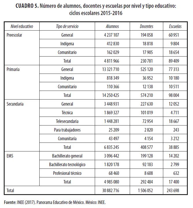 El SEN se caracteriza por su gran tamaño y por la diversidad de su oferta educativa. En el cuadro 5 se muestra una clasificación de los tipos de servicios educativos que se ofrecen en la educación obligatoria, de acuerdo con el nivel escolar de que se trate (preescolar, primaria, secundaria y EMS). En este cuadro se puede apreciar el número de alumnos, docentes y centros escolares que conforman la educación obligatoria del país. En total, en el ciclo escolar 2015-2016, la educación obligatoria estaba conformada por cerca de 30.8 millones de alumnos, 1.5 millones de docentes y 243.6 mil escuelas. Por el número de alumnos y escuelas, el nivel educativo más grande es el de primaria; mientras que el más pequeño, por su número de alumnos, es el preescolar, seguido por la EMS (INEE, 2017).