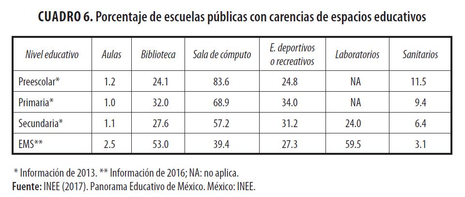 Los recursos escolares en México todavía son escasos y no se distribuyen bajo un principio de equidad (INEE 2017). Una proporción considerable de centros educativos no cuenta con los espacios necesarios para ofrecer a los estudiantes las mínimas oportunidades de aprendizaje y de bienestar escolar. Por ejemplo, como se muestra en el cuadro 6, muchas escuelas carecen de biblioteca, sala de cómputo, espacio deportivo, área recreativa, laboratorios y sanitarios. Más aún, una de cada 100 escuelas no cuenta con aulas para impartir clases. Asimismo, alrededor de uno de cada 10 preescolares y primarias no dispone de un sanitario en su inmueble, a pesar de que es una condición básica de higiene para la comunidad escolar.