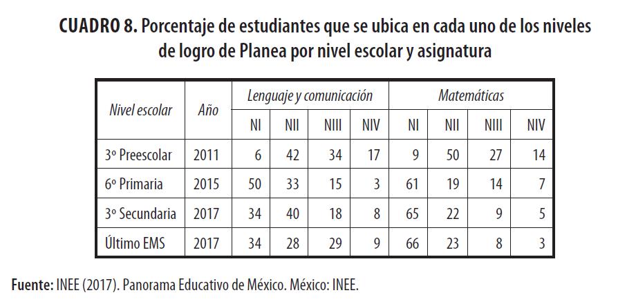 En el caso de México, el INEE desarrolla las evaluaciones nacionales; antes, se hacía con una batería de pruebas conocidas como Excale (Exámenes para la Calidad y el Logro Educativos) y, actualmente, con pruebas de conocimientos similares conocidas como Planea (Plan Nacional para la Evaluación de los Aprendizajes). Las actuales evaluaciones de logro académico que realiza el INEE están diseñadas para conocer el grado en que los estudiantes dominan los aprendizajes básicos (por ahora, Lenguaje y comunicación y Matemáticas) que se establecen en los planes y programas de estudio nacionales, de los grados terminales de 3º de preescolar, 6º de primaria, 3º de secundaria y último grado de EMS. México también participa en los estudios internacionales de PISA1 (estudiantes de 15 años), LLECE2 (estudiantes de 3º y 6º de primaria) e ICCS3 (estudiantes de 2º de secundaria). En su conjunto, todas estas evaluaciones de aprendizaje sirven para evaluar la eficacia del SEN, en cuanto a los aprendizajes que logran los estudiantes en distintas asignaturas y grados escolares. Dado que sería muy extenso describir los resultados de todas estas evaluaciones, a continuación sólo se resumirán, a manera de ejemplo, los que representan cada nivel educativo. Con ellos se podrá estimar el grado en que el SEN está cumpliendo con sus metas de aprendizaje. El cuadro 8 muestra el porcentaje de estudiantes que se ubica en cada uno de los cuatro niveles de logro educativo que utiliza el INEE para reportar sus resultados, donde: el primero, NI, indica que el estudiante presenta un nivel insuficiente de aprendizaje; el segundo nivel, NII, indica que el aprendizaje del estudiante es apenas básico; en el tercer nivel, NIII, los estudiantes dominan suficientemente bien los contenidos curriculares y, finalmente, en el NIV se ubican los estudiantes que dominan con maestría las competencias escolares evaluadas.