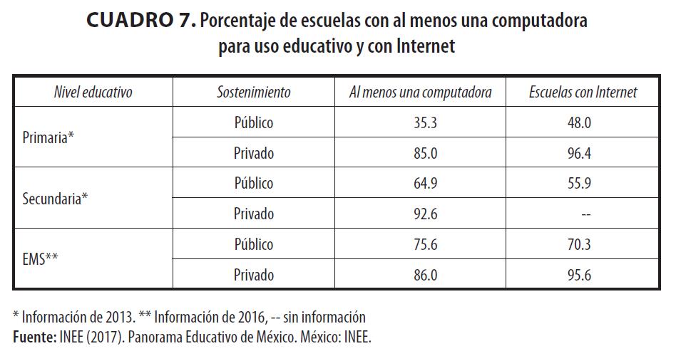 Por otro lado, una herramienta fundamental para el proceso de enseñanza aprendizaje que todo centro educativo debe poseer y poner a disposición de maestros y estudiantes es el equipo de cómputo con acceso a Internet. Al igual que en el caso de los espacios físicos, una gran cantidad de centros escolares mexicanos carece de esta herramienta, situación que se muestra en el cuadro 7 para los distintos niveles educativos y centros escolares por tipo de sostenimiento. Queda claro que las escuelas de sostenimiento privado están mejor equipadas que las de sostenimiento público.