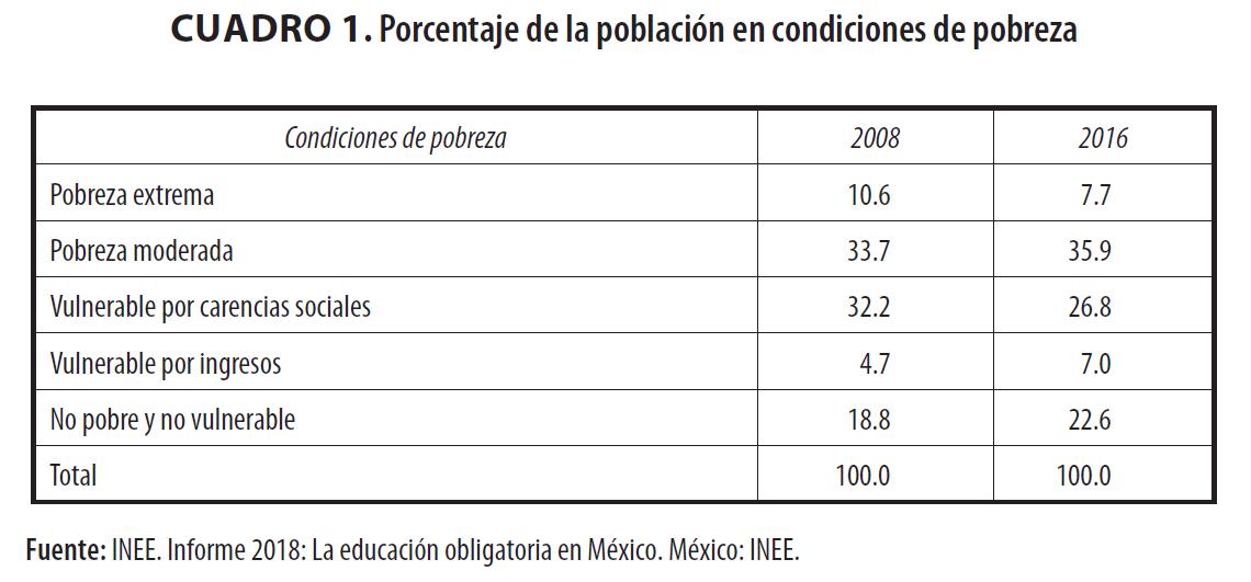 Por otro lado, hay que tomar en cuenta que el país se desenvuelve en un contexto de pobreza económica e inequidad social, con sus grandes diferencias entre entidades federativas. El cuadro1 presenta el porcentaje de la población mexicana que vivía en distintas condiciones de pobreza en 2008 y 2016. Aquí se puede observar que, aunque el país ha avanzado en este indicador, sigue habiendo una cantidad importante de personas que padecen de una pobreza extrema o moderada (43.6%); sólo el 22.6% de la población no es pobre ni vulnerable (INEE, 2018).