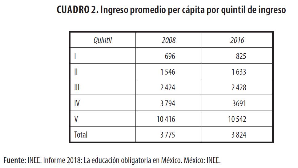 Además de la pobreza, el país padece una gran desigualdad en la distribución de los ingresos de su población económicamente activa. El cuadro 2 muestra las diferencias en ingreso de las personas, de acuerdo con el quintil en que se ubicaban. Así, en 2016, la quinta parte de la población más pobre (quintil I), ganaba en promedio $825.00 pesos al mes, mientras que la del quintil V gana $10 542.00 En este cuadro también se podrá apreciar que los salarios entre 2008 y 2016 no han variado significativamente estas diferencias (INEE, 2018).