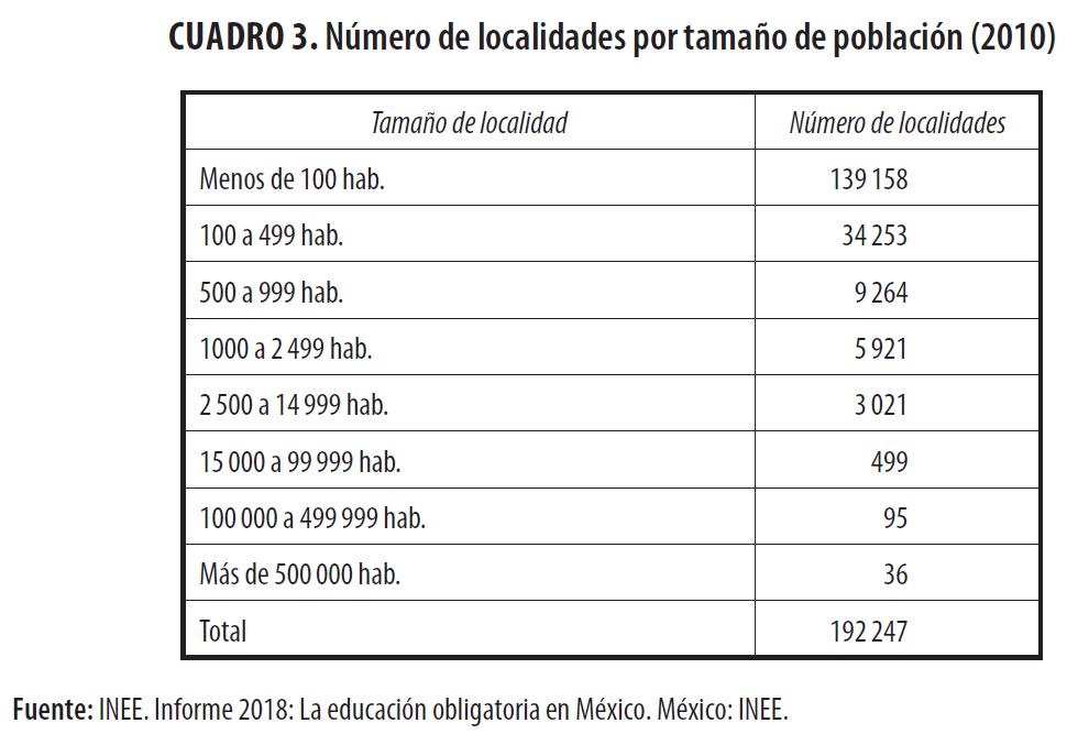 Por otro lado, el país se caracteriza por tener una población que vive de manera concentrada en grandes ciudades y, a la vez, en una gran cantidad de poblaciones rurales y pequeñas. El cuadro 3 muestra que hasta 2010, el país contaba con poco más de 192 mil localidades, de las cuales 139 mil tenían menos de 100 habitantes y 36 más de medio millón (INEE, 2018).