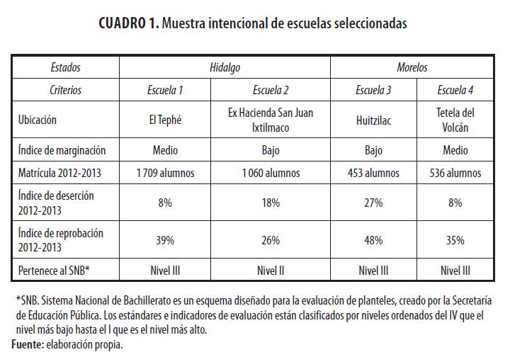 Con base en un análisis de la estadística oficial que proporcionó la Dirección General de Educación Tecnológica Agropecuaria (DGETA) sobre el abandono escolar e índices de reprobación y eficiencia terminal ordenada por estado y plantel, se seleccionaron dos escuelas de cada una de las entidades federativas mencionadas, una con un porcentaje alto de deserción y otra con bajos índices. Asimismo, se consideró que una de estas escuelas se ubicara en un contexto rural y otra que tuviera características más urbanas (cuadro 1).