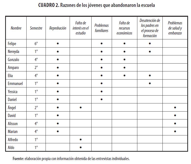 La falta de interés de los padres de familia en el proceso de formación de sus hijos contribuyó al abandono en cuatro casos, esta razón estuvo asociada a problemas familiares y falta de recursos económicos. Los jóvenes mencionaron que “citaron a mis papás, pero no han venido, no han dado respuesta” (Elia), “cuando citaban a mi mamá, casi no venía” (Emmanuel), “cuando citaban a mi mamá, no venía a la escuela” (Felipe).