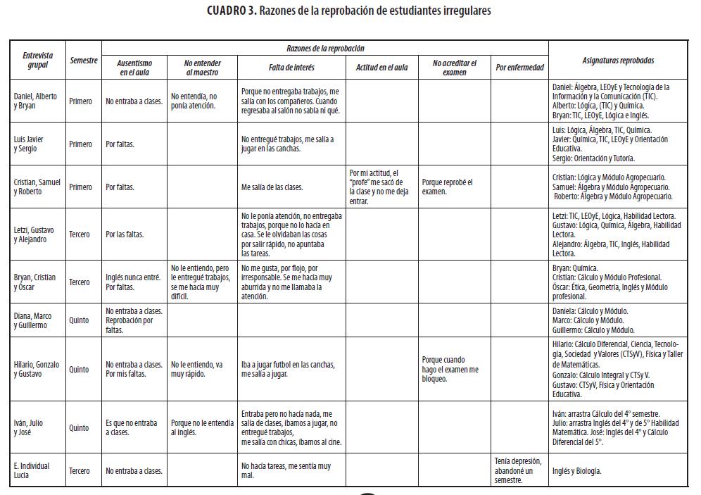 Dada la importancia del fenómeno de la reprobación se realizaron entrevistas grupales a alumnos irregulares que estaban rezagados en sus asignaturas y en riesgo de abandonar la escuela. En todos