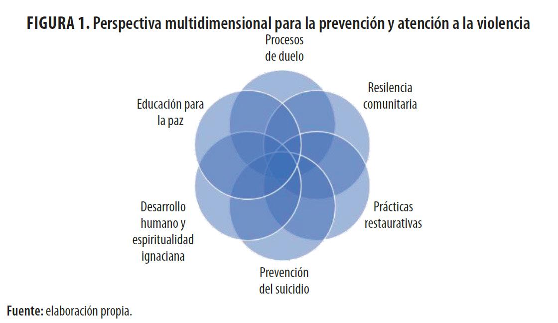 Resultan evidentes los planteamientos innovadores en la integración de los distintos abordajes que dan lugar a una visión y prácticas multidimensionales que caracterizan el quehacer de la institución, desde las seis dimensiones mencionadas, cuya emergencia ha respondido a situaciones propias del contexto en el que se desarrollan: procesos de duelo, resiliencia comunitaria, educación para la paz, prácticas restaurativas, prevención del suicidio, desarrollo humano y espiritualidad ignaciana, que apuntan ya a mostrar la complejidad de las experiencias y del contexto. El contexto evidentemente no es lo que le ocurre a los otros, ya que forma parte de la trama de la vida cotidiana de los habitantes de esa población en cualquiera de los círculos en los que se encuentren, en este caso, de todos los actores sociales que participan en el quehacer de la institución. De esta manera, los escenarios y las acciones humanas tienen sentido en marcos sociales que permitan comprender las experiencias y las elaboraciones y reelaboraciones de significados. Así, el contexto forma parte de la realidad construida en las narraciones.