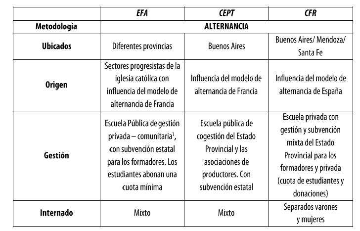 Además de las EFA, en Argentina (país donde se realizó el estudio de campo) han ido surgiendo otras instituciones que llevan a cabo sus actividades a partir de la puesta en práctica de la metodología de alternancia: los Centros Educativos para la Producción Total (CEPT) y los Centros de Formación Rural (CFR). El cuadro 1 presenta un comparativo entre los tres tipos de instituciones vinculadas a la metodología de alternancia: