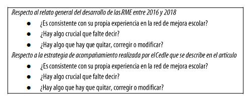 Como ejercicio adicional de verificación de la validez de las conclusiones construidas por el equipo investigador respecto de la teoría de acción del Cedle-UCT y su evolución, se entregaron copias impresas del borrador de este artículo a 27 líderes educativos participantes en las diez RME acompañadas en La Araucanía, a quienes se solicitó leerlo y ofrecer retroalimentación. El cuadro 1 enlista las preguntas guía que se pidió considerar a los revisores internos.