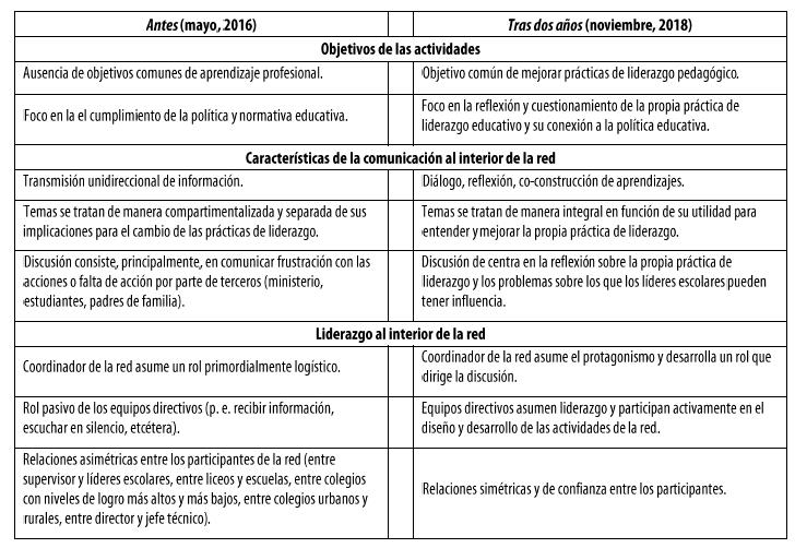 Al contrastar los objetivos y la naturaleza de las actividades en las RME, antes y dos años después de la llegada de los amigos críticos del Cedle-UCT a las reuniones de estas redes, es posible identificar una transición de la “gramática escolar” hacia una cultura de colaboración consistente con los principios de las comunidades profesionales de aprendizaje. Mientras que antes era común observar relaciones verticales de autoridad y control entre líderes y participantes de la red, así como un gran énfasis en la mera transmisión de información, a dos años de la llegada de los amigos críticos se observan más relaciones horizontales de diálogo, aprendizaje mutuo, con un énfasis en la reflexión crítica sobre la propia práctica profesional. En el cuadro 2 se contrasta el antes y el ahora de las actividades en las RME en la región de La Araucanía.