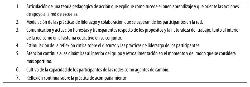 1. Articulación de una teoría pedagógica de acción que explique cómo sucede el buen aprendizaje y que oriente las acciones de apoyo a la red de líderes escolares. Desde el inicio, el trabajo del Cedle-UCT ha estado orientado por una visión compartida de cómo aprendemos. Esta visión permea las acciones de los amigos críticos al participar en las RME. En el caso del Cedle-UCT, los principios pedagógicos que orientan sus acciones incluyen conectar el trabajo a los intereses de los participantes; priorizar el diálogo en el grupo y el uso de buenas preguntas por sobre la explicación frontal; identificar constantemente los conocimientos ya existentes al interior de la red para favorecer la construcción colectiva de nuevos conocimientos; escuchar antes que hablar. Todos éstos son principios pedagógicos que van a contrapelo de la cultura escolar convencional, al tiempo que son compatibles con los modos de operar de las comunidades profesionales de aprendizaje.