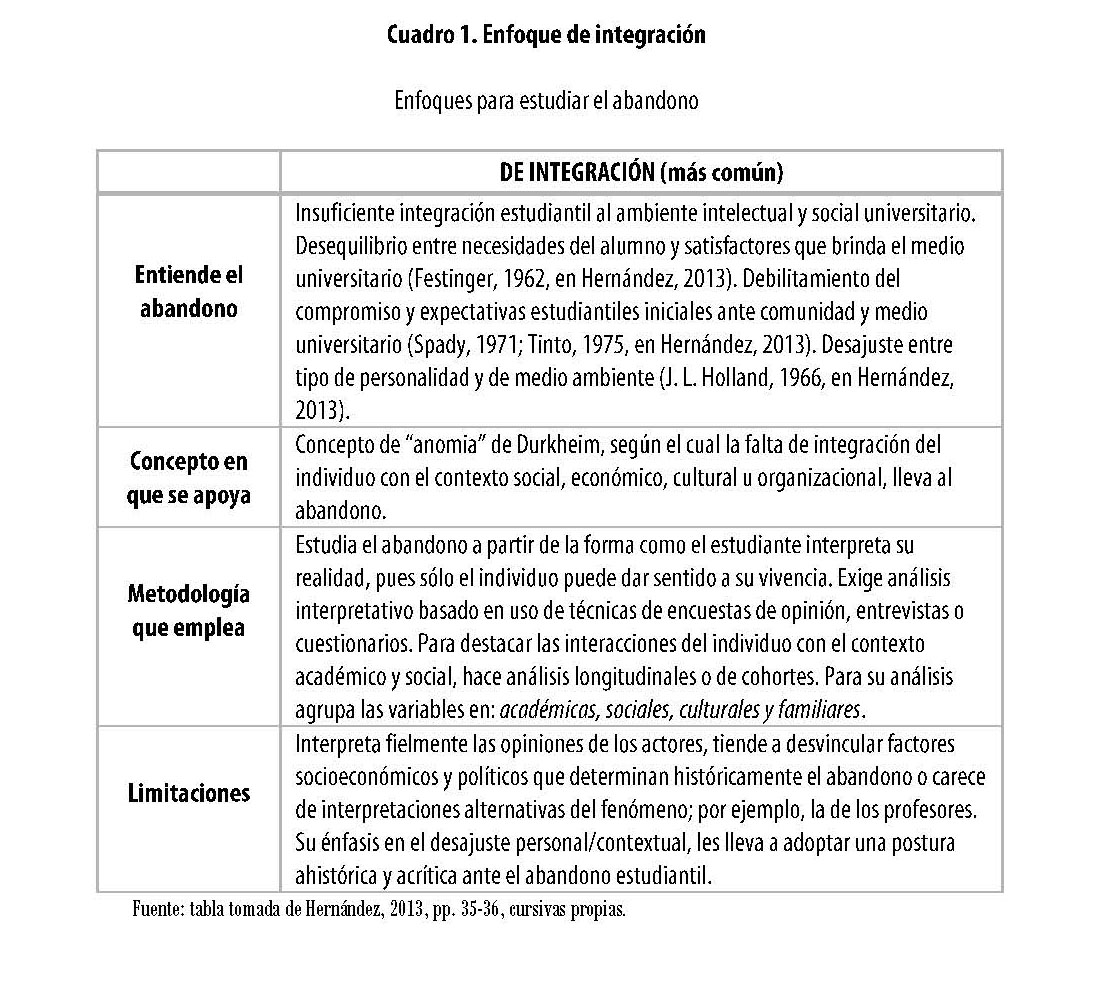 tabla tomada de Hernández, 2013, pp. 35-36, cursivas propias.Como se observa, este enfoque de integración se nutre de distintas problematizaciones, porque el abandono no se puede explicar desde una perspectiva simplista, por ende, es necesario recurrir a diversas estrategias para tratar de disminuirlo, pues pensar en una erradicación sería un tanto romántico, dadas las disímiles circunstancias en el proceso enseñanza-aprendizaje que lleva al alumnado a optar por la no continuidad de su formación en determinado campo académico o IES, o bien, de un sistema educativo.
