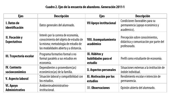 El abandono es un indicador de la eficiencia terminal y, en el caso particular del SUAyED de la Facultad de Economía, surgió la preocupación de conocer por qué su población tiene un alto porcentaje de abandono en el primer año de su ingreso a la licenciatura. Por ello, se realizó un estudio diagnóstico para detectar las principales razones. Se ha tomado como referencia la Generación 2011-1 porque, en términos curriculares, ya tendría que estar en proceso de culminación de estudios y titulación.