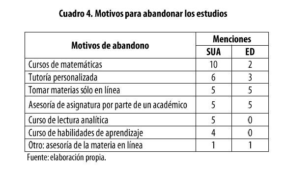 El alumnado encuestado manifestó que, en caso de reanudar sus estudios en el SUAyED, algunas condiciones que podrían apoyar su permanencia serían: cursos de matemáticas –por la carga tan fuerte de éstas en la carrera–, tutoría y asesorías de las asignaturas por académicos y cursar materias en línea. Se observa el poco interés en los hábitos de estudio con sólo cuatro menciones, cuando una característica de estos sistemas es el aprendizaje en autonomía (cuadro 4).
