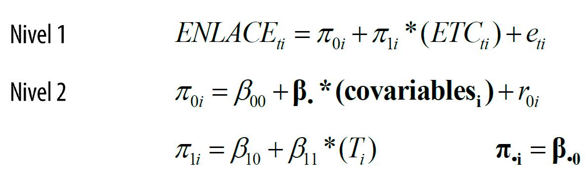 El análisis DID se estimó utilizando un modelo multinivel longitudinal (Raudenbush y Bryk, 2002). Como se muestra en las siguientes ecuaciones jerárquicas, en el nivel uno se incluyen los puntajes de la prueba ENLACE de Español y Matemáticas para cada escuela en cada año escolar, así como un indicador binario que identifica si la escuela ha implementado el PETC (ETCti = 1) o no (ETCti = 0) durante el año escolar t. En el nivel dos del análisis se incluye información a nivel del i-ésimo centro escolar e información de las covariables sociodemográficas; las covariables seleccionadas fueron aquellas que presentaron muy bajo nivel de multicolinealidad entre ellas. En el nivel dos también se incluye un indicador binario que denota si al menos durante un año escolar la escuela ha implementado el PETC (Ti = 1) o no ha implementado el PETC (Ti = 0).