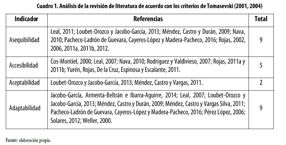 La diversidad temática para abordar a la misma población es amplia. De cara a la construcción de un problema de investigación, se decidió hacer un análisis de la literatura revisada usando los cuatro indicadores del derecho a la educación propuestos por Tomasevski (2001, 2004). Como se decía, para realizarlo, se tomó en consideración el objetivo de investigación, las preguntas de investigación –en los casos que se enunciaron–, así como los resultados y las conclusiones de los estudios revisados. También cabe aclarar que algunas investigaciones abonan al estudio de más de un criterio, dado el alcance de cada uno de los casos. El resultado del análisis se sintetiza en el cuadro 1.
