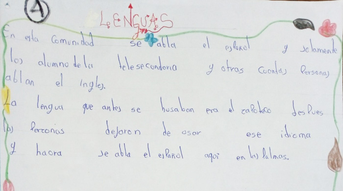 Lo anterior podría deberse a que muchos maestros con los que hemos platicado desconocen el origen étnico del Municipio y sus comunidades7 y, por tanto, consideran que no es un pueblo originario en el que haya que trabajar en algún aspecto específico de la comunalidad. Otros maestros, aunque también desconocen este origen, asumen que la comunidad tiene sus propios conocimientos comunitarios y alientan a sus alumnos a investigar al respecto. Por ejemplo, en la comunidad de Las Palmas, en el ciclo escolar 2017-2018, el maestro de sexto grado pidió a sus alumnos que realizaran una monografía de la comunidad donde incluyeran las leyendas, la gastronomía, las fiestas e incluso la lengua originaria, etcétera (figura 2).