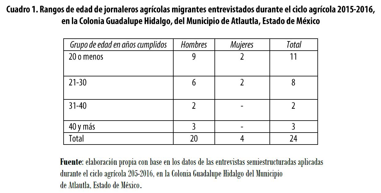 En total se realizaron 32 entrevistas, ocho de las cuales fueron a informantes clave y 24 a JAM. Durante el ciclo agrícola 2015, se recuperaron los relatos de vida de siete hombres y dos mujeres y para el siguiente, el de 13 hombres y dos mujeres. De acuerdo con las entrevistas de los informantes clave, entre cada ciclo arribaron alrededor de 1 000 migrantes, cuyas edades eran variables, desde bebés de cero años, hasta hombres y mujeres de poco más de 50 años, incluyendo, niños, niñas y adolescentes (cuadro 1).