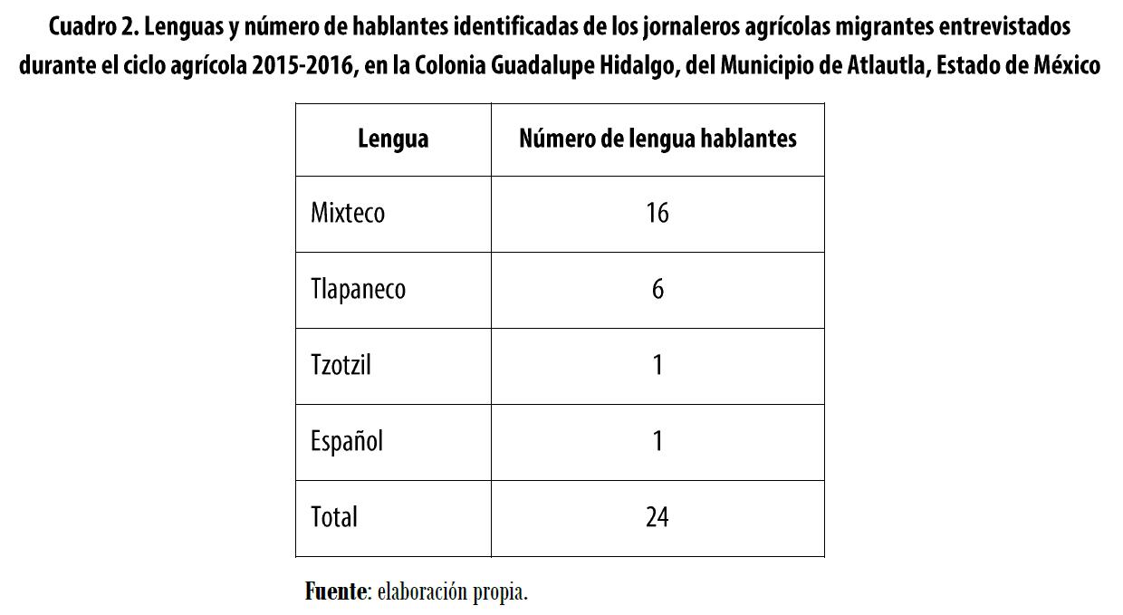 Los migrantes provenían principalmente de los estados de Guerrero, Oaxaca y Chiapas. La mayoría de origen indígena. La lengua predominante identificada fue el mixteco, en menor medida tlapaneco y sólo un caso, tzotzil. La población (cuadro 2) identificada era de aproximadamente 1 000 personas en cada ciclo agrícola, con edades que oscilaban entre los 0 a 55 años.