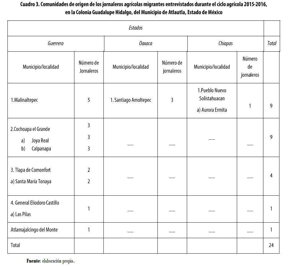 Los jornaleros provenientes del estado de Guerrero, se identificaron como originarios de los municipios de Cochoapa el Grande (de las comunidades de Barranca de Ceniza, Joya Real y Calpanapa); Tlapa de Comonfort (de las comunidades de Las Pilas y Santa María Tonaya); Malinaltepec, y Atlamajalcingo del Monte (de la localidad de Piedra Blanca). Los que llegan del estado de Oaxaca provienen del municipio Santiago Amoltepec y los originarios del estado de Chiapas de Pueblo Nuevo Solistahuacán, de la comunidad de Aurora Ermita. A continuación, en el cuadro 3, se presentan los estados los municipios y las comunidades de origen.