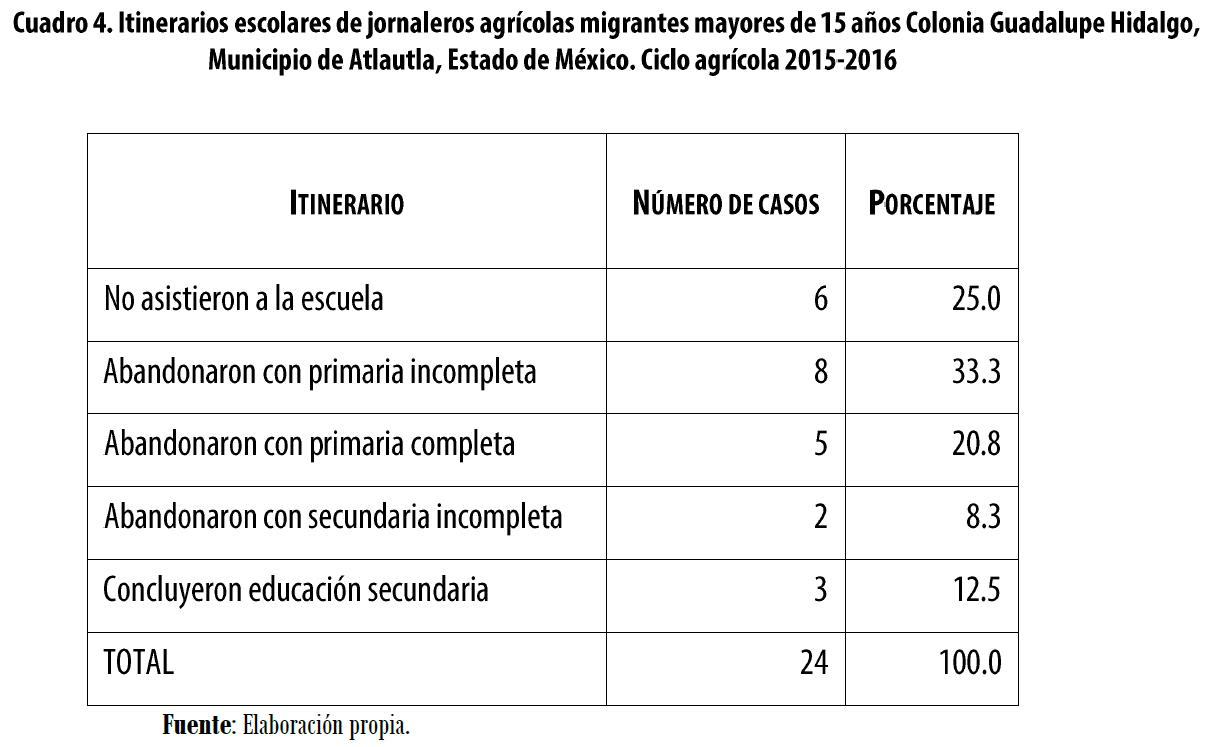 En los primeros cuatro itinerarios escolares se pueden identificar claramente patrones comunes que impidieron el acceso y permanencia de NNA-JAM al sistema educativo. A saber, la constante movilidad en el territorio, las condiciones de pobreza, la incorporación al trabajo infantil, maltrato por parte de los docentes y la falta de escuelas son algunos de los factores que impiden a niñas, niños y adolescentes de familias de jornaleros agrícolas migrantes recibir atención educativa.