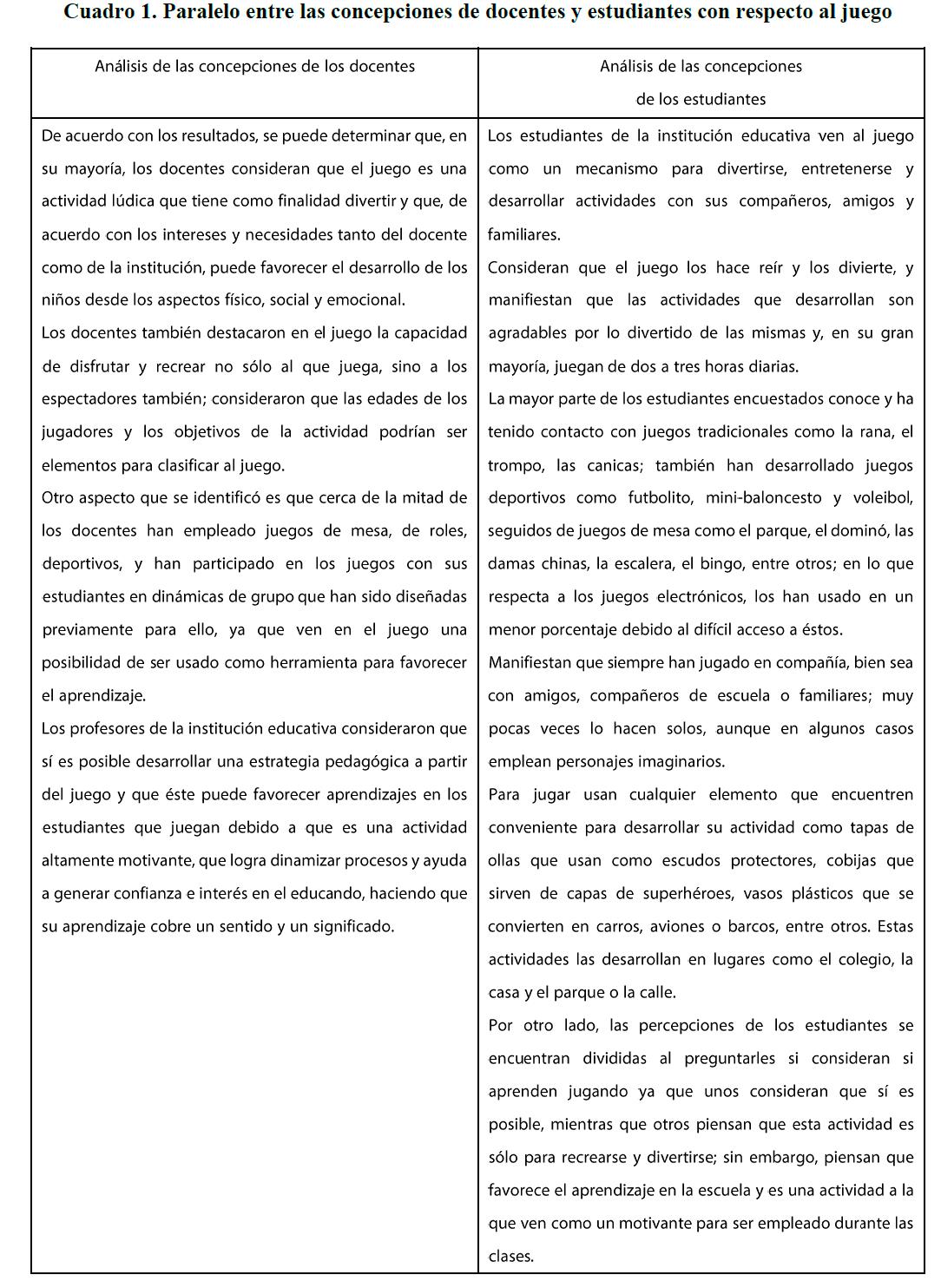 Al finalizar el ejercicio de análisis de cada una de las preguntas se procedió a realizar un cuadro comparativo donde se expone, en términos generales, las percepciones de docentes y estudiantes, a fin de encontrar afinidades y diferencias para comprender de mejor manera cómo se iba a abordar la construcción de juegos en la clase de ciencias descrito en el cuadro 1.