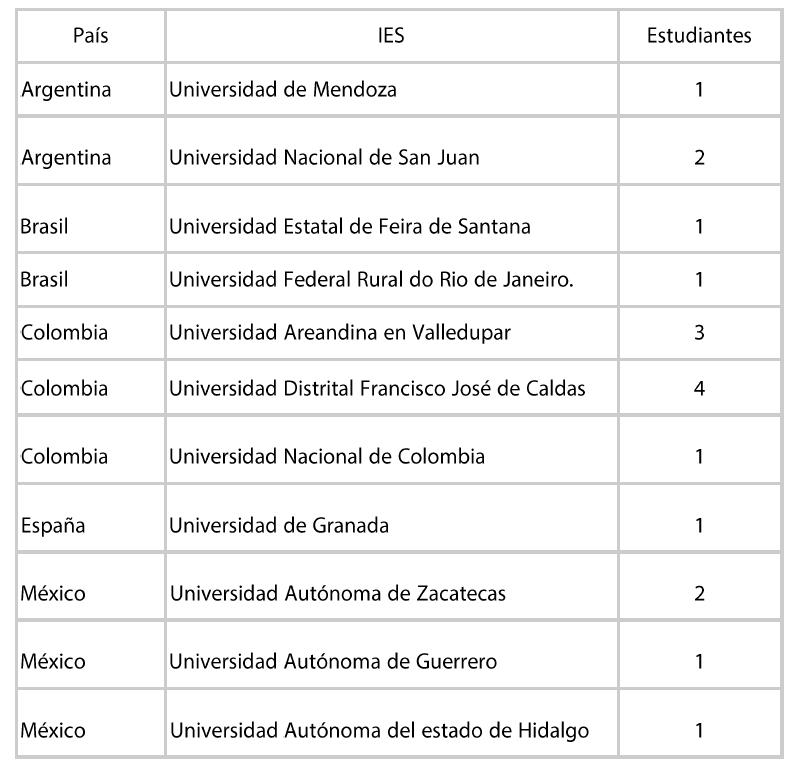 El 30 de junio de 2020 se envió la encuesta a 32 estudiantes que se encontraban realizando estancias académicas con fechas de inicio y duraciones diferenciadas en 14 programas educativos de la institución. El instrumento distribuido a través de un formulario de Google se habilitó del 30 de junio al 7 de julio y de los 32 posibles informantes, se recuperó la información de 18 estudiantes con edades que oscilan entre los 19 hasta los 49 años, aunque 14 de ellos tienen entre 21 y 24 años. En relación con su sexo y país de origen observamos que las 12 mujeres y 6 hombres son oriundos de cinco países, tres de Argentina, dos de Brasil, ocho de Colombia, uno de España y cuatro de tres estados de la República mexicana (dos de Zacatecas, Guerrero, Hidalgo) y vienen de 12 distintas instituciones de educación superior (cuadro 1).