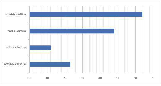 En cuanto a las habilidades de síntesis fonética, los registros de observación indican que son pocas las actividades donde se desarrollan. De los 64 segmentos que forman parte de esta categoría, únicamente cinco hacen referencia a este aprendizaje. Se promueve mediante actividades donde se unen los sonidos de consonantes con vocales, repitiendo en voz alta, por ejemplo, “P, P, P”, mientras trazan una línea hacia la ‘I’ para al final decir “PI” (2:60). Escribiendo palabras, identificando cada uno de los fonemas para, posteriormente, integrarlos: “F: ¿qué sonido es éste? A: sss-uu-mm-oo F: ahora de corrido. A: sumo” (7:79) o realizando este mismo procedimiento, pero con actividades de escritura.