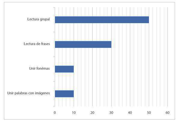 Adicional a la lectura de cuentos en voz alta, los niños, de manera individual o grupal, leen palabras o frases, lo cual se lleva a cabo mediante los siguientes ejercicios: