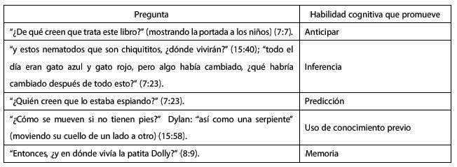 Formular preguntas abiertas fue otra de las estrategias que contribuyó al aprendizaje de la lectura, específicamente al desarrollo de habilidades cognitivas y lingüísticas en los niños. Entre las cognitivas se encuentran: la anticipación, la inferencia, la predicción, el uso de conocimiento previo y la memoria, todas ellas funciones mentales que, de acuerdo con Cassany (2006), posibilitan la comprensión de los textos y la construcción del significado de la lectura.