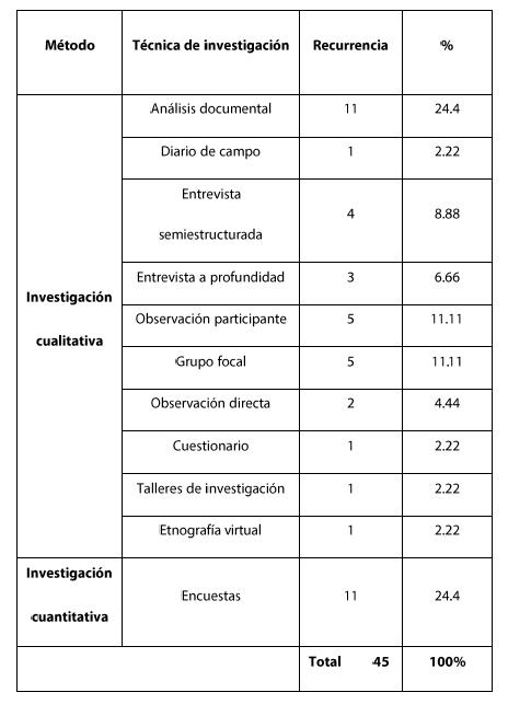 En segundo lugar, se encuentran dos técnicas cualitativas de investigación, tales como la observación participante y el grupo focal, ambas con un porcentaje de recurrencia de 11.11% y, con menor porcentaje, las técnicas entrevista semiestructurada, entrevista a profundidad, observación directa, diario de campo, cuestionario, talleres de investigación y etnografía virtual.
