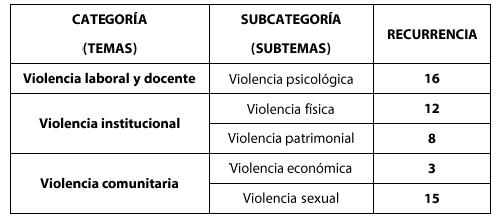 Meyer (2010) señala que delimitar objetos de estudio no es repetir mecánicamente algunos pasos de carácter metodológico, sino abordar un problema o fenómeno a partir de textos teóricos referentes a fin de contribuir al avance de una línea de investigación en esta área del conocimiento. Con el propósito de reconocer el principal objeto de estudio dentro de las investigaciones, e identificar los tipos de violencia que se revelan dentro de las IES, utilizando como técnica de investigación el análisis de contenido, el cuadro 6 muestra las categorías y subcategorías de violencia de género, clasificadas según su recurrencia dentro de los artículos de investigación.