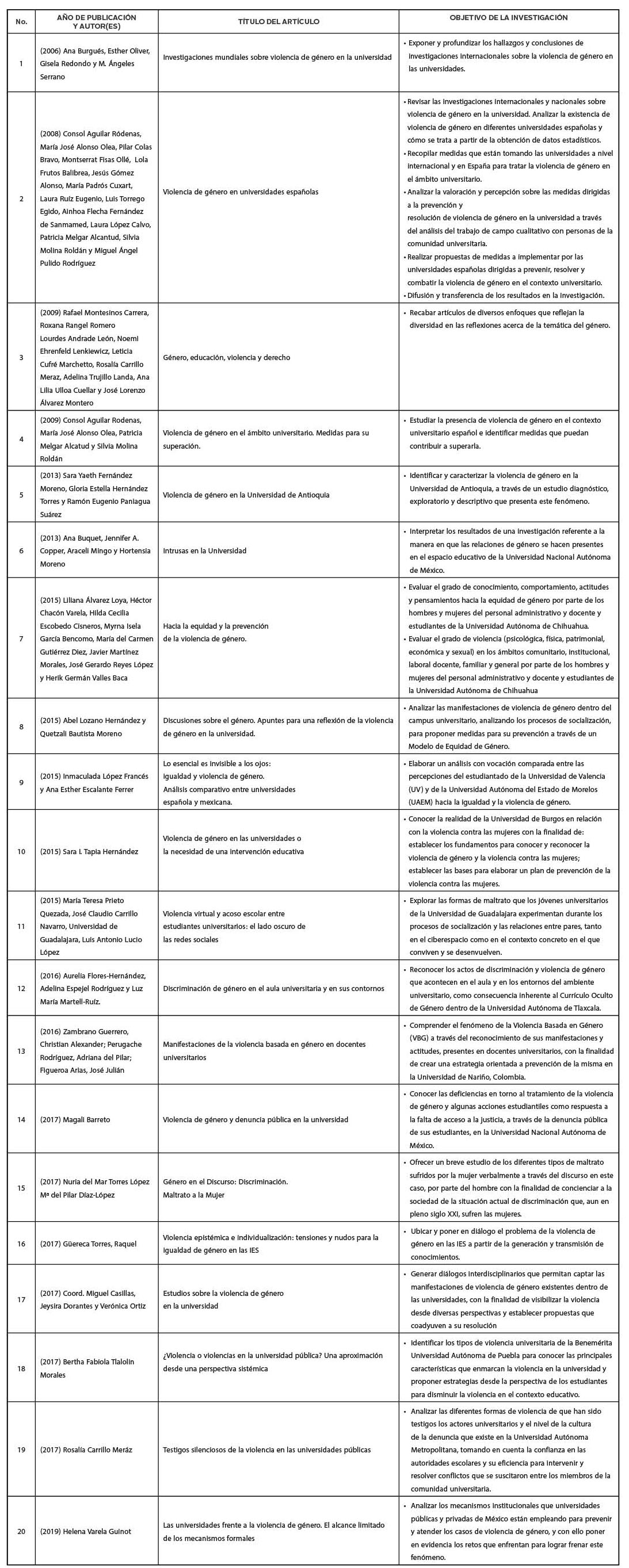 Un primer acercamiento puso de manifiesto que las investigaciones responden a objetivos de investigación semejantes, encaminados a analizar las manifestaciones de violencia en sus diversas modalidades, conocer las percepciones de los estudiantes acerca de los roles de género de sus integrantes y recopilar las medidas de atención y prevención al fenómeno de violencia de género presente en las IES. Las 20 publicaciones fueron revisadas considerando los siguientes elementos: año , autores, país, título, resumen, palabras clave, objetivo, participantes, técnicas de investigación y recomendaciones del autor.