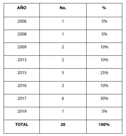 En el cuadro 2 se puede apreciar la cantidad de publicaciones examinadas por año. A partir de esto, se puede concluir que las universidades han aumentado la producción de artículos de investigación con respecto a la temática de violencia de género; tomando en cuenta un avance significativo de 5% a 30% entre 2006 y 2017 respectivamente, es decir, un aumento de 25% en un lapso de 11 años.