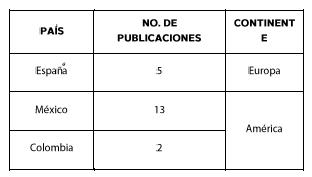 A propósito de ello, el cuadro 3 muestra el número total de artículos en relación con el país y continente de origen. Al menos entre las publicaciones revisadas, en primer lugar se encuentra México, con un total de 13 artículos de investigación producidos; posteriormente, España, con un total de cinco y, por último , Colombia con dos artículos; esto da un total de 15 publicaciones procedentes de América y únicamente cinco de Europa. Pese a esto, la violencia de género se enmarca como una problemática que afecta a mujeres de todos los países, todas las clases sociales, culturas y edades (Burgués, Oliver, Redondo, et al., 2006). Aunque reconocemos que existen otros países con producción sobre el tema, de acuerdo con el objetivo del estudio, la producción analizada correspondió, sin embargo, a los países que se han mencionado.