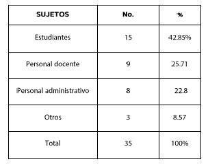 Siguiendo el cuadro, el número de sujetos de investigación analizados son, comúnmente, los estudiantes, con una recurrencia de 42.85% dentro de las investigaciones, seguido por el personal docente con un porcentaje de 25.71%. Con relación al personal administrativo, que posee una recurrencia de 22.8%. Cabe destacar que es aquí donde cobra relevancia la mirada integral de los estudios de género en las universidades, puesto que los climas inhóspitos en las IES no son privativos del salón de clases, sino que se extienden a todos los ámbitos de la acción humana, incluido el laboral. Existe, por tanto, una profunda preocupación respecto de la situación de las empleadas administrativas que padecen violencia de género en el lugar de trabajo (Buquet et al., 2013).
