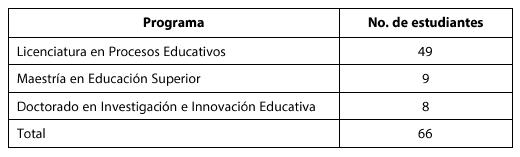 En concordancia con la propuesta conceptual sobre la experiencia vivida, se siguió una metodología cualitativa, cuyo interés se concentró en las interpretaciones de los sujetos sobre su mundo de vida, haciendo hincapié en el papel que juega el contexto en la construcción de los datos y en la capacidad explicativa del investigador (Vasiliachis, 2006). En un amplio espectro, es posible sostener que la metodología es inductiva porque: “El examen interpretativo de la experiencia vivida se caracteriza, desde un punto de vista metodológico, por relacionar lo particular con lo universal, la parte con el todo, lo episódico con la totalidad” (Van Manen, 2003, p. 56). Debido a que el lenguaje es la vía de acceso a la experiencia vivida, se optó por recuperar los testimonios de los participantes a través de entrevistas semiestructuradas. El acopio de los datos se efectuó en dos momentos, en primera instancia se utilizó un cuestionario que se aplicó, durante el mes de junio de 2018, a 66 estudiantes del área de educación de la Facultad de Filosofía y Letras: 49 de la Licenciatura en Procesos Educativos (LEPD), nueve de la Maestría en Educación Superior (MEDS) y ocho del Doctorado en Investigación e Innovación Educativa (DIIE).2 Ver cuadro 1.