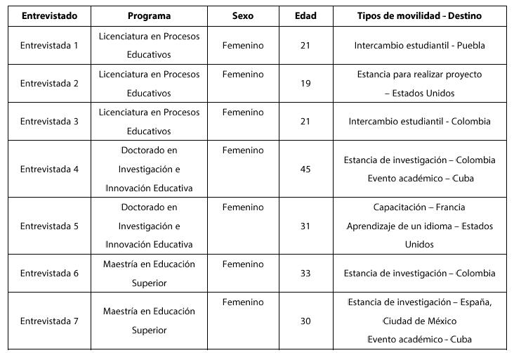 Durante las entrevistas se planteó una pregunta generadora: ¿de qué manera los estudiantes conciben la movilidad?; si bien se asume que la participación en eventos académicos, estancias de investigación o intercambios estudiantiles son algunas modalidades, fue necesario conocer las significaciones que ellos le atribuyen. En la primera sección de la entrevista se cuestionó acerca de las motivaciones personales y profesionales para participar en movilidades, así como los criterios para seleccionar una institución y un país de destino. La siguiente sección incluyó interrogantes sobre las estrategias institucionales que promueven o dificultan la movilidad, y la última, se orientó a indagar sobre los aspectos sociales que limitan estas acciones, así como lo más significativo de su vivencia.