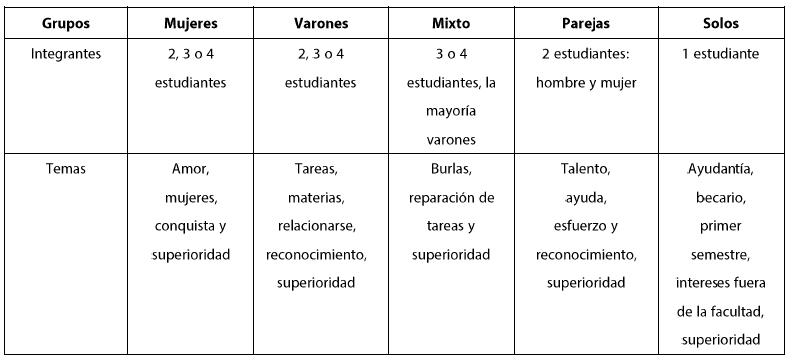En el cuadro 1 se muestra cómo se agrupa la mayoría del estudiantado y también de lo que suele hablar cuando están juntos.