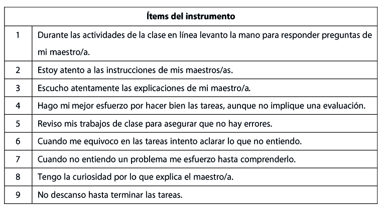 En el marco de análisis del compromiso se implementaron dos tipos de instrumentos. Por una parte, se utilizó la escala de autorreporte de dimensiones del compromiso escolar de Archambault y Vandenbossche-Makombo (2014), en su versión original cuenta con 22 ítems que indagan sobre el compromiso del alumnado con las materias de matemáticas y francés. En el cuadro 1 se observa la adaptación del instrumento al contexto mexicano, en la cual se preguntó por el compromiso en general. Las modalidades de respuesta planteadas para la escala van de 1= nunca a 5= siempre. El cuestionario de compromiso escolar presenta una consistencia interna de α = .84.