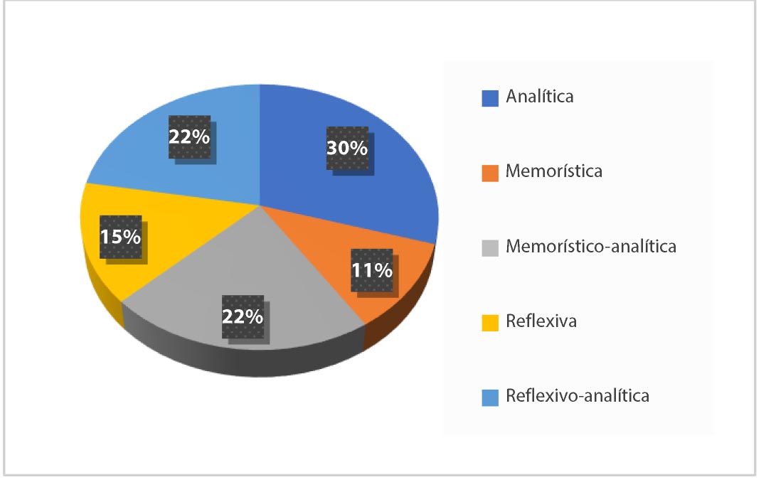 En la figura 4 se nota una tendencia a preguntas del tipo analítica (combinada con otro tipo o puramente), con más de 50%. Además, es interesante notar que muchas de estas preguntas analíticas son vinculadas a contenidos del lenguaje musical o musicología (como el reactivo 23). Conjuntamente, estos reactivos analíticos generalmente son de los sub-ejes B3 o B5, como veremos más adelante. Por otro lado, las preguntas de tipo reflexivo también son recurrentes y, por lo general, se vinculan a los campos de educación musical, educación o etnomusicología (como el reactivo 30 arriba). Por ende, las preguntas que requieren un conocimiento memorizado y declarativo (como el reactivo 15) son las que tienen menor frecuencia, y esto es totalmente diferente de los análisis del Enade de otros años (Borne y Juvêncio, 2018; Borne, 2020; Borne, Hora y Silva, 2020), lo que sugiere un desarrollo epistemológico desde el punto de vista educacional sobre la concepción del examen.