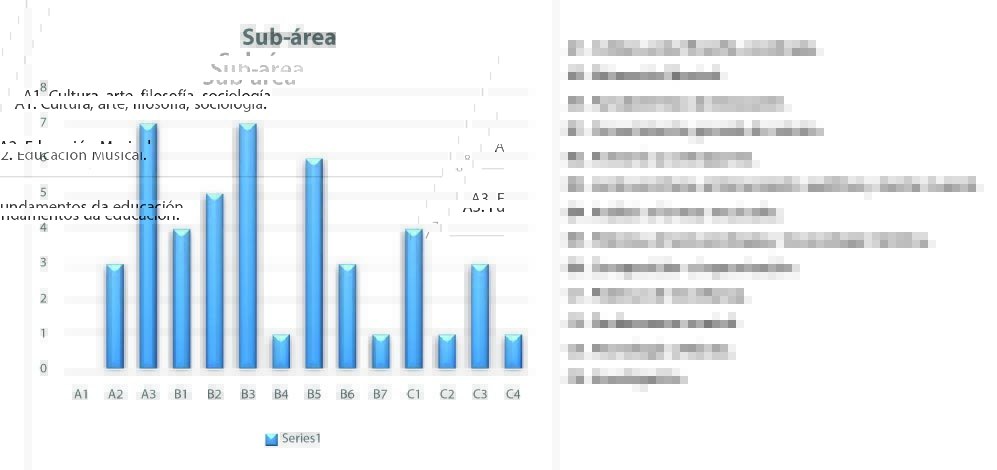 Lo primero que se destaca es la prevalencia masiva del eje B, que se enfoca en los conocimientos específicos del área de música, y es casi igual a la suma de A + C. Más detalladamente, por otro lado, se nota que los sub-ejes A3, B2, B3 y B5 sobresalen, siendo que todos los otros sub-ejes no presentan frecuencias superiores a cinco reactivos cada uno. Éstos tienen algo que se podría considerar una distribución más equitativa (aunque con prevalencia total del eje B). Además, el hecho de que B2 y B3 (armonía y contrapunto, y lectoescritura, entrenamiento auditivo y teoría musical, respectivamente) estén entre los sub-ejes con mayor número de preguntas quizá no sea un acaso, sino que éstas hacen parte de un corpus curricular típicamente vinculado al campo del lenguaje musical, el cual posee una gran carga horaria en los currículos tradicionales de música (Borne, 2020; Pereira, 2014). El concepto de Habitus Conservatorial, acuñado por Pereira (2014), parece brindar pistas para explicar tal fenómeno. Según el autor, hay una prevalencia o dominancia de contenidos generalmente atribuidos al contexto del conservatorio musical –que, como el nombre lo dice, conserva la tradición musical y su modelo de enseñanza, basado en la partitura, en la práctica exhaustiva y repetitiva del virtuoso y en clases tutoriales–, lo que puede no ser acorde con determinados contextos musicales.