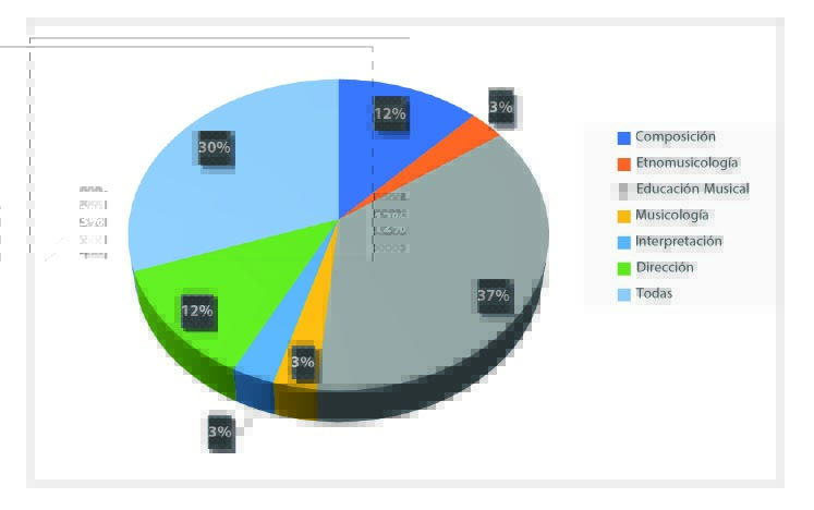 Organicé los datos en seis posibles terminales, que reflejan los énfasis de nivel de licenciatura y, en algunos casos, posgrados brasileños: educación musical, interpretación, composición, dirección, etnomusicología y musicología (aunque no haya licenciatura para estas dos últimas en Brasil, la oferta e investigación en el campo es grande, por lo que se han desarrollado a nivel posgrado), como se ve en la figura 7. Además, un punto destacable es que las preguntas del campo de dirección musical nunca son exclusivas de este campo, sino que generalmente vienen vinculadas a reactivos de composición, lo que sugiere un intrínseco enlace de naturaleza práctica del director con el compositor, como agentes de creación musical (como ejemplo, el reactivo 20 de la prueba).