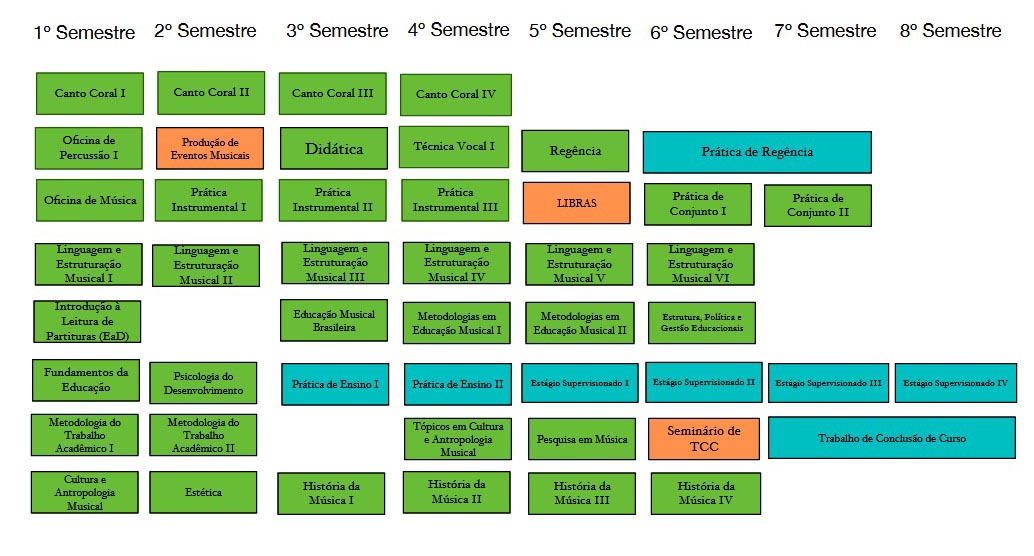 Por otro lado, un dato interesante (y hasta preocupante) son los 33% de reactivos que estudiantes de otras carreras tendrían más facilidad para responder que los de educación musical. Como he afirmado anteriormente, no es decir que estos reactivos representan un saber específico de un compositor, intérprete, etnomusicólogo, director o musicólogo, sino que éstos tendrían más herramientas cognitivas para contestar a la pregunta, dada su formación universitaria; un egresado de educación musical quizá no tendría estas mismas herramientas, y podría perjudicarse a sí mismo o a su institución por un saber que no estaba previsto en su currículo (ejemplos de ello se encuentran en los reactivos 20, 25, 30 anteriormente descritas). A modo de evidencia de lo comentado anteriormente, Borne (2020), al hacer un estudio sobre la presencia de las materias de solfeo y entrenamiento auditivo en los currículos oficiales de Brasil (y su muestra fue de más de 50% de los cursos en actividad), también verifica que la mayoría de los programas de licenciatura en educación musical siguen una perspectiva muy tradicional, acorde con la perspectiva conservatorial descrita por Pereira (2014). Como ejemplo de esta perspectiva más tradicional, traigo el mapa curricular de la Universidad Federal de Ceará-Campus Sobral (UFC-Sobral), que en 2019 actualizó su programa de estudios. Como se puede notar abajo, hay asignaturas obligatorias de cultura y antropología musical y no hay ninguna asignatura obligatoria dedicada a la composición/creación musical o la musicología (solamente hay Historia de la Música). Cuando uno se detiene mejor en el programa de estudios completo (UFC, 2018), se nota que los estudiantes tienen la asignatura optativa Composición y Arreglo I y II; sin embargo, no todos la cursan durante su formación inicial. Vinculando el programa de la UFC-Sobral con lo debatido sobre las terminales, esto quiere decir que los estudiantes de esta institución probablemente tendrán más elementos para responder reactivos específicos sobre etnomusicología, pero no las de composición (y, quizá, musicología histórica) (figura 8).