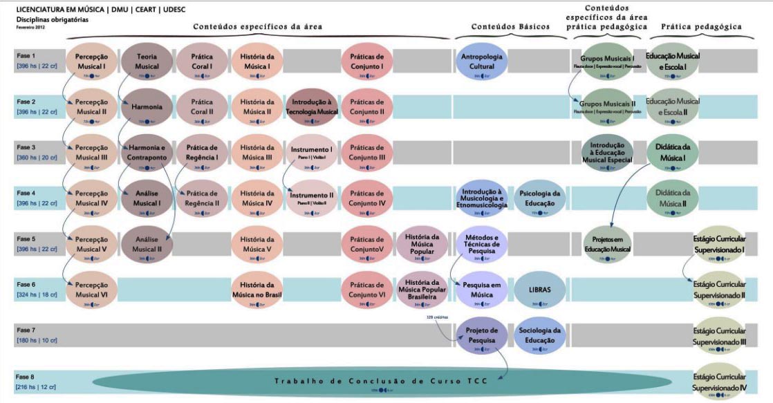 Además, el reactivo 15 trae cinco géneros musicales típicos de Brasil netamente populares: samba, choro y bossa nova, originalmente surgidos en Río de Janeiro, y baião y frevo, originalmente del noreste, especialmente del estado de Pernambuco; uno puede argumentar que cada brasileño/a debería saber estos géneros, lo que no es así, dado que tenemos otras tantas manifestaciones musicales, heredadas o no, como la polca, la milonga, el calipso, entre otras, además de todos los géneros eruditos. Entonces, esta pregunta 15 da visibilidad a los géneros populares,15 pero no son todos los currículos los que dan énfasis a estos repertorios. Brasil es un país de talla continental, conllevando a diferentes manifestaciones musicales y culturales, por lo que es sumamente difícil que todas las carreras logren incorporar todas estas manifestaciones, y, cuando mucho, desarrollan temas regionales o de mayor impacto nacional. Ejemplos de esto pueden verse en diferentes programas de estudios, como el de la licenciatura en educación musical de la Universidade Estadual de Santa Catarina (Udesc). En su mapa curricular (figura 9), no se ubica ninguna asignatura que dé cuenta de diferentes géneros de música popular, y, al ver con más cuidado el programa de estudios completos (Udesc, 2011), tampoco se encuentra este tipo de contenido –incluso en las materias de Historia de la Música en Brasil o Historia de la Música Popular, pues se enfocan más en los aspectos sociales e históricos como tales, y no en la estructura musical de los diferentes géneros (como fue expuesto en el reactivo 15).