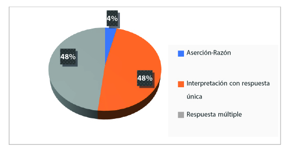 • la tipología de las preguntas (que son definidas por el mismo INEP): aserción-razón, interpretación con respuesta única, y respuesta múltiple;
