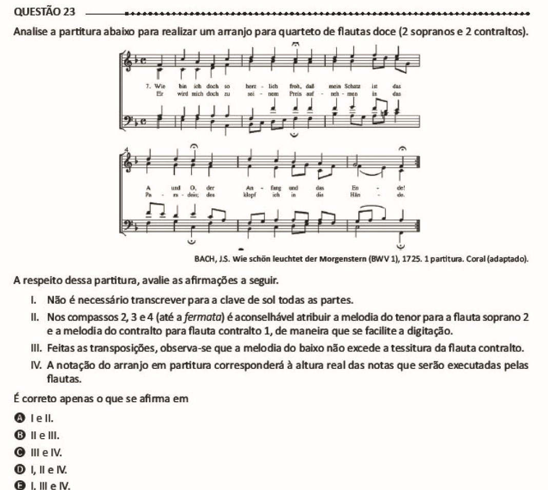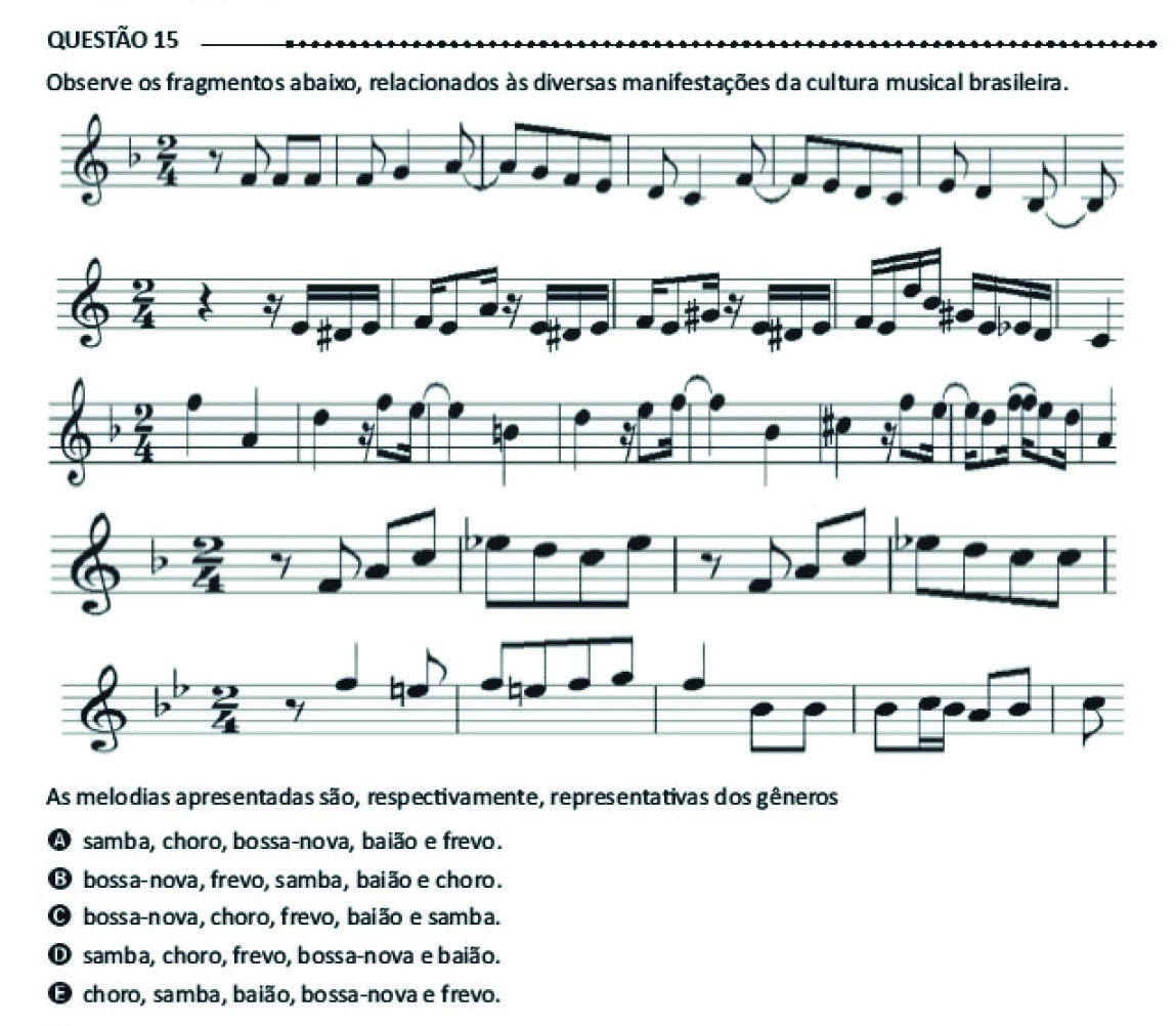 La partitura es uno de los elementos concretos que la música posee, y está fuertemente vinculada a una tradición hegemónica advenida del conservatorio europeo (Borne, 2017; Pereira, 2014), –pese a que sea un poco polémica en las discusiones contemporáneas del área de educación musical como un todo (como fue visto en Pereira, 2014), puesto que es generalmente vista como un elemento vinculado a una dominación y colonización del conocimiento (que llega a Latinoamérica desde la música occidental europea)–. En el caso del Enade, ella está presente en más de 40% de los reactivos, sea en la pregunta o en la respuesta. Por ello, especulo que su utilización en una prueba de larga escala también sirva para enmarcar el lugar y la especificidad del conocimiento musical frente a otras áreas. Además, el conocimiento de la partitura, usualmente aprendido en materias como lenguaje o teoría musical, puede demostrar el nivel de exigencia o desarrollo de un determinado programa curricular sobre el dominio de este registro, y también como un elemento importante en el perfeccionamiento de otras habilidades que involucren la escritura musical, como el análisis o la armonía musical. De esta manera, la partitura, sea en la pregunta o en la respuesta (como se observa en los reactivos 15 o 23 arriba), el Enade 2014 generalmente referencia un contenido del eje B (Conocimiento específico), el cual es la mayoría de los reactivos en 2014 –como será comentado posteriormente.