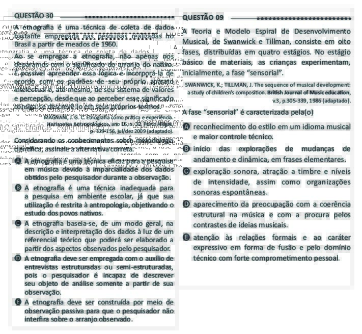 Para finalizar estas conclusiones, se puede hacer una breve reflexión sobre la posible concepción de música que integra el Enade: uno puede percibir en el examen como un todo (y en los ejemplos dados en este texto) que la polisemia de la música también está presente entre los reactivos del examen brasileño. Para utilizar la terminología de Green (2008), hay reactivos que se centran más en los significados intrínsecos y otros más en los delineados, y los diversos matices entre ellos. Es decir, el Enade no se cierra en una sola idea de qué es la música, entendiéndola como arte, lenguaje, comunicación, ciencia, etcétera.