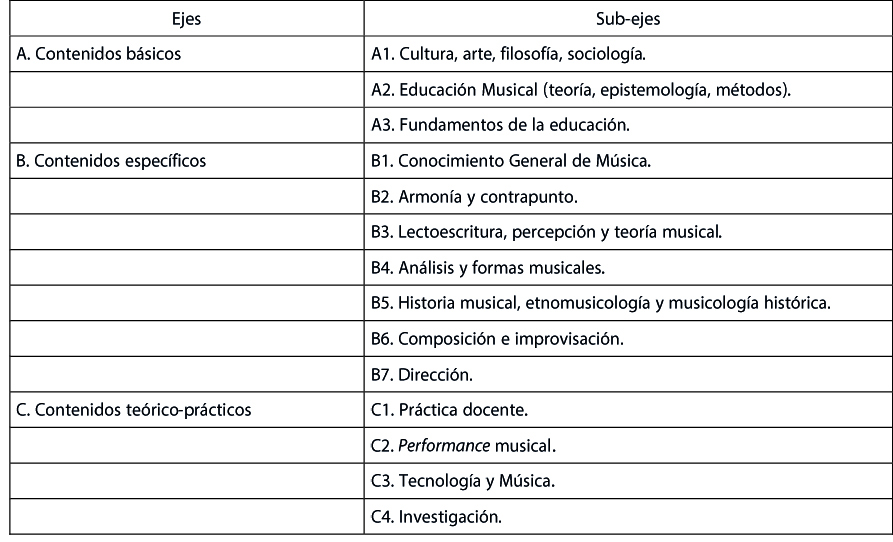 La opción que se hizo por utilizarlos como guías de organización y contraste se dio porque los reactivos específicos del Enade son creados con base en estas mismas directrices. En otras palabras, nada más lógico que analizar los reactivos del Enade –que, finalmente, evalúa las propuestas curriculares de las IES– con base en el documento que las orienta en sus diseños curriculares. Además, para profundizar, se han derivado de estos ejes del saber musical otros sub-ejes, los cuales fueron pensados a partir de un estudio sobre currículos de licenciatura de Borne (2017), según el cuadro 1.